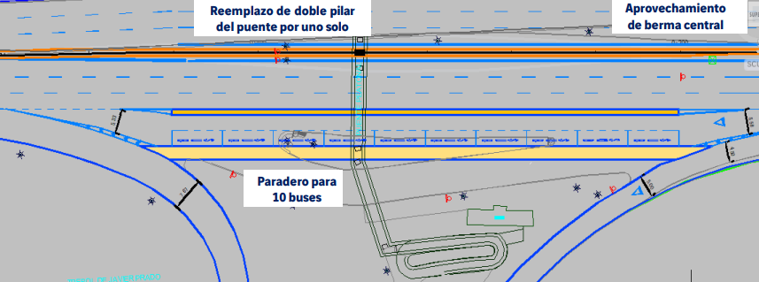 • Se propone aprovechar el espacio de la berma central para generar un nuevo paradero con espacio para diez buses, permitiendo las operaciones del transporte público sin bloquear el acceso desde la Panamericana Sur.